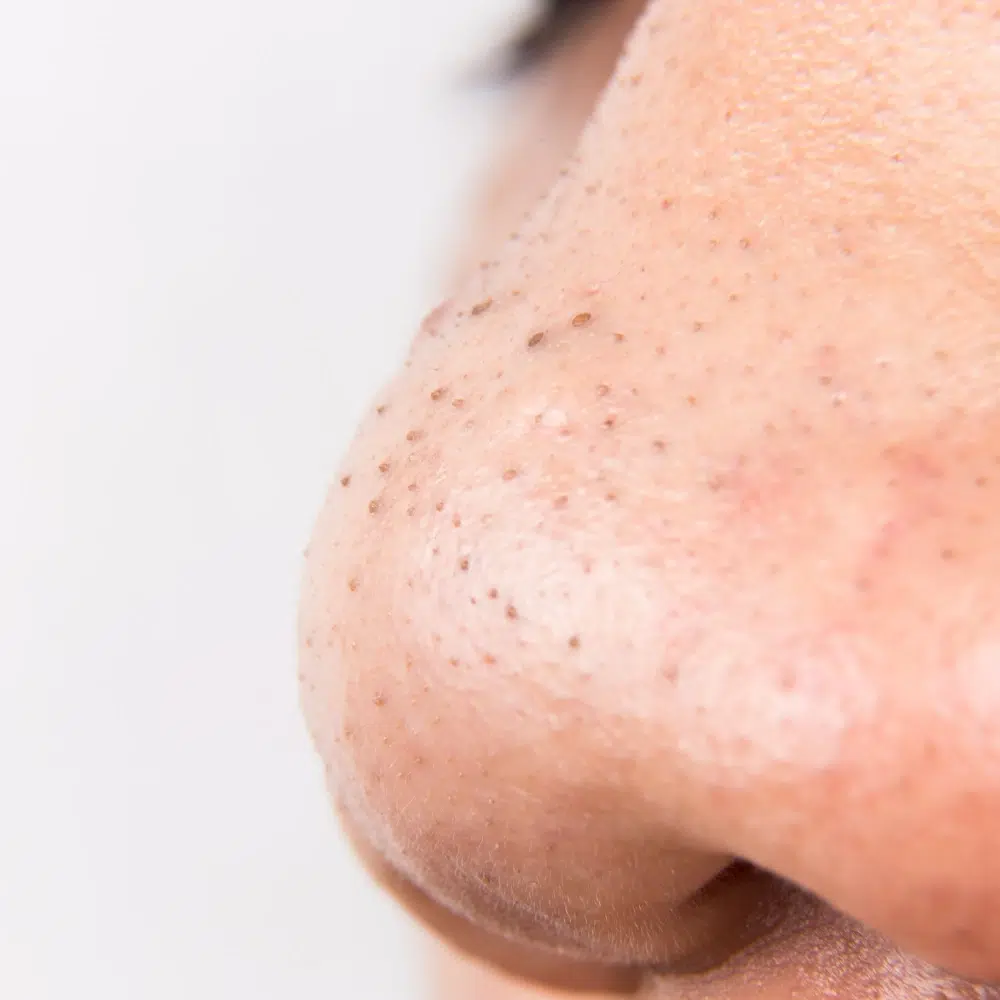 Open clogged pores where oil oxidizes and turns dark. Not caused by dirt but by oil and dead skin cells.